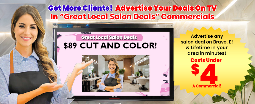 Increase your salon's visibility in your community and get more clients by being in “Great Local Salon Deals” tv commercials in your area. Being in these commercials is a fast, easy and super low cost way to show your deals and promotions on tv in your area. Even if you have a small ad budget and think tv advertising is too expensive or hard, you can now advertise your salon on tv!