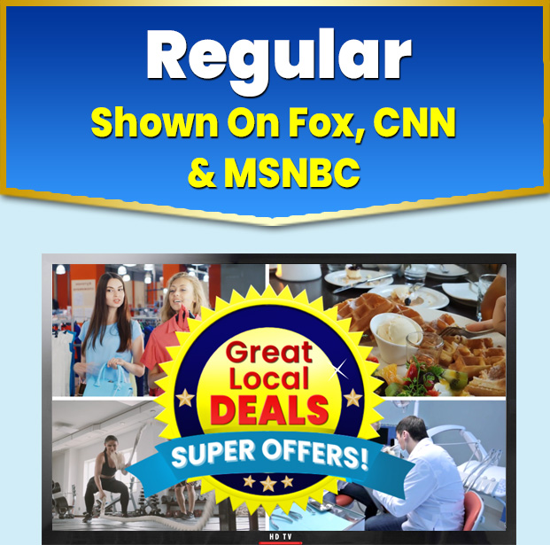 “Great Deals In Coeur d'Alene” commercials are shown on major tv channels at high viewing times, including prime time. Be in Regular commercials, which show to general audiences, Salon Deals commercials, which target female audiences, or Restaurant Deals commercials, which also show to general audiences. - A low price -- under $4 a commercial.